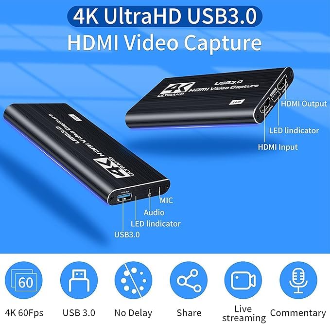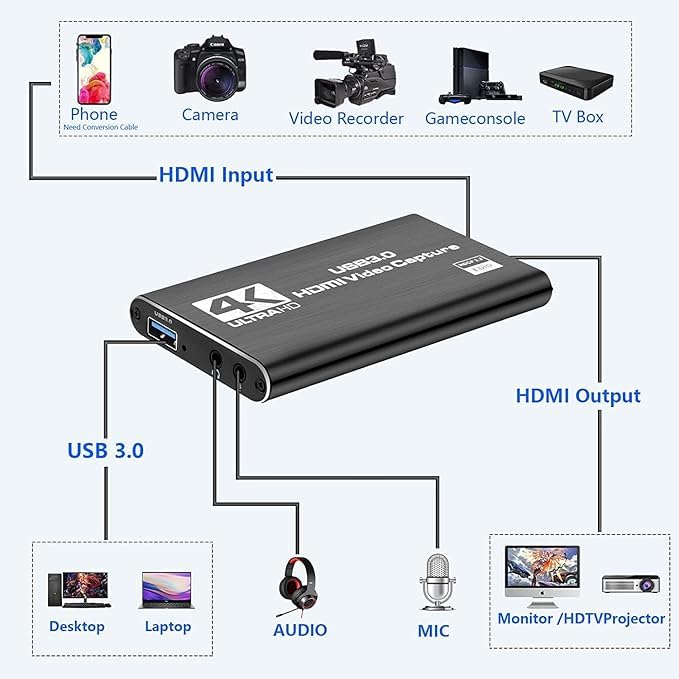 4K USB 3.0 HD Video Seize is totally different from different seize playing cards in the marketplace. This seize card is extra versatile. We upgraded the answer inside to make the decision extra actual impact, and it isn’t straightforward to caught and extra smoother. Enter Interface: 4K*2K 60HZ HDMI HD video sign. 4K USB 3.0 HD Seize. HD streaming and recording with no latency. HDMI ring out interface(Help 4K*2K 60Hz) ring out. Can instantly into the cell laborious disk or USB flash drive. Keep away from driving, keep away from host, free software program recording anytime and anyplace. Help HDCP Protocol decoding. 1. HDMI Seize Card, Microware USB3.0 Recreation Video Converter with HDMI Loop-out Help Full HD 1080P 60HZ Mic In and Audio Out 2. The Video Seize Card Suitable Home windows Linux Youtube OBS OS X Twitch for PS3 PS4 Xbox One Xbox 360. Join the sign sources resembling Blu-Ray Participant, Play Station , audio/video receiver, satellite tv for pc receivers with HDMI output interfaces with a HDMI cable to the machine HDMI enter Insert the USB3.0 cable head to USB3.0 interface, the opposite aspect of the cable into your pc’s USB3.0 interface. Clearly and shortly share display screen content material in convention rooms and on-line conferences, hook up with displays, with out putting in any software program, simply join a laptop computer or pill by way of HDMI to start out sharing.