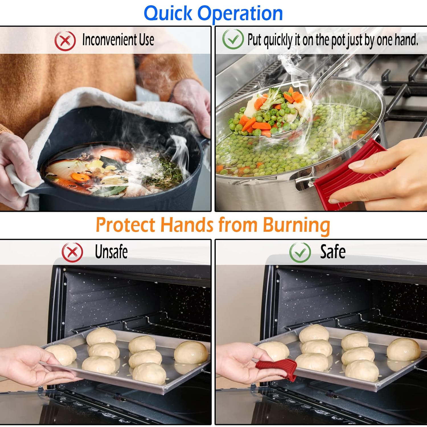 🔥[General Compatibility] The silicone potholders are used on varied handles of pots and lids, similar to, forged iron pot, frying pan, skillet pans, stockpot, enamel casserole pan, even the kettle, providing a splendid safety on your fingers when you are lifting the recent pot or lid.