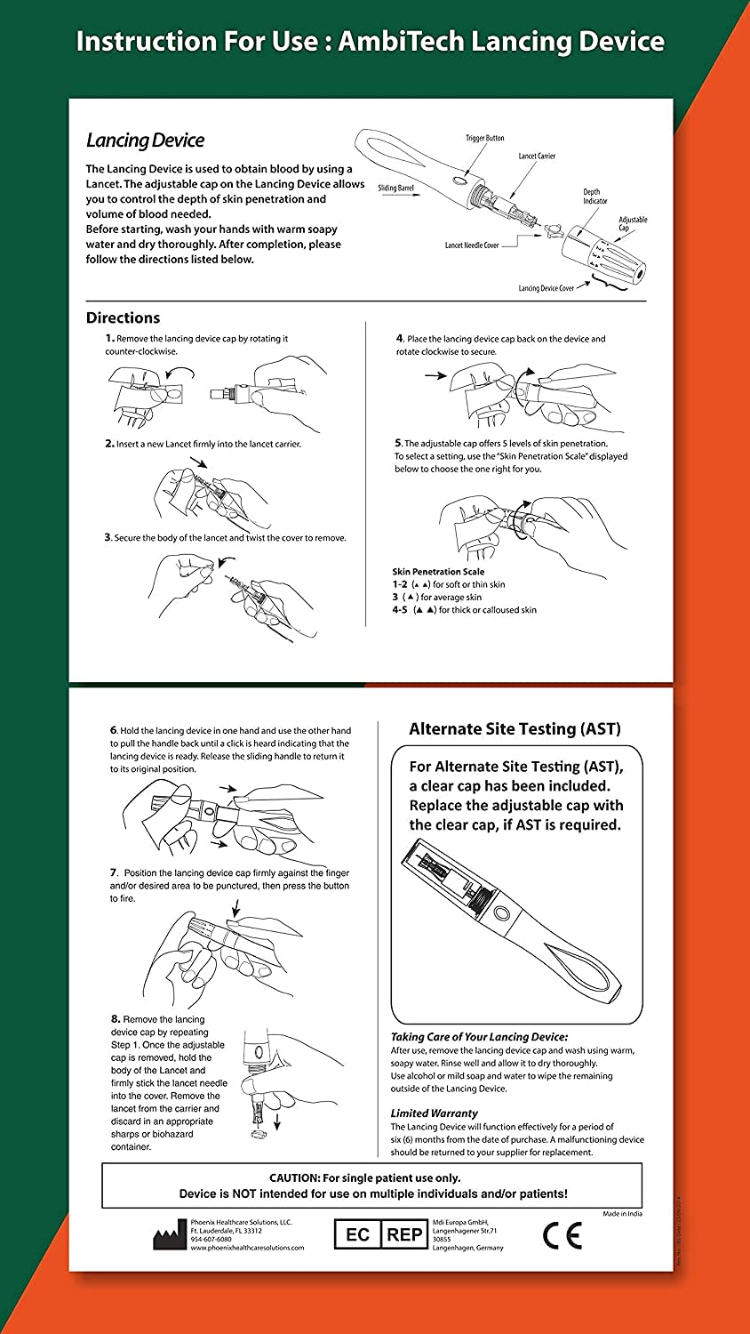 Ambitech lancet directions to be used : 1) . Wash arms with cleaning soap and water. Dry completely. 2) choose fingertip website, barely off-center. 3) insert lancet into lancing machine, take away cap and use. 4) apply drop of blood to check strip; wipe extra from finger. 5) recap lancet;discard in acceptable containe