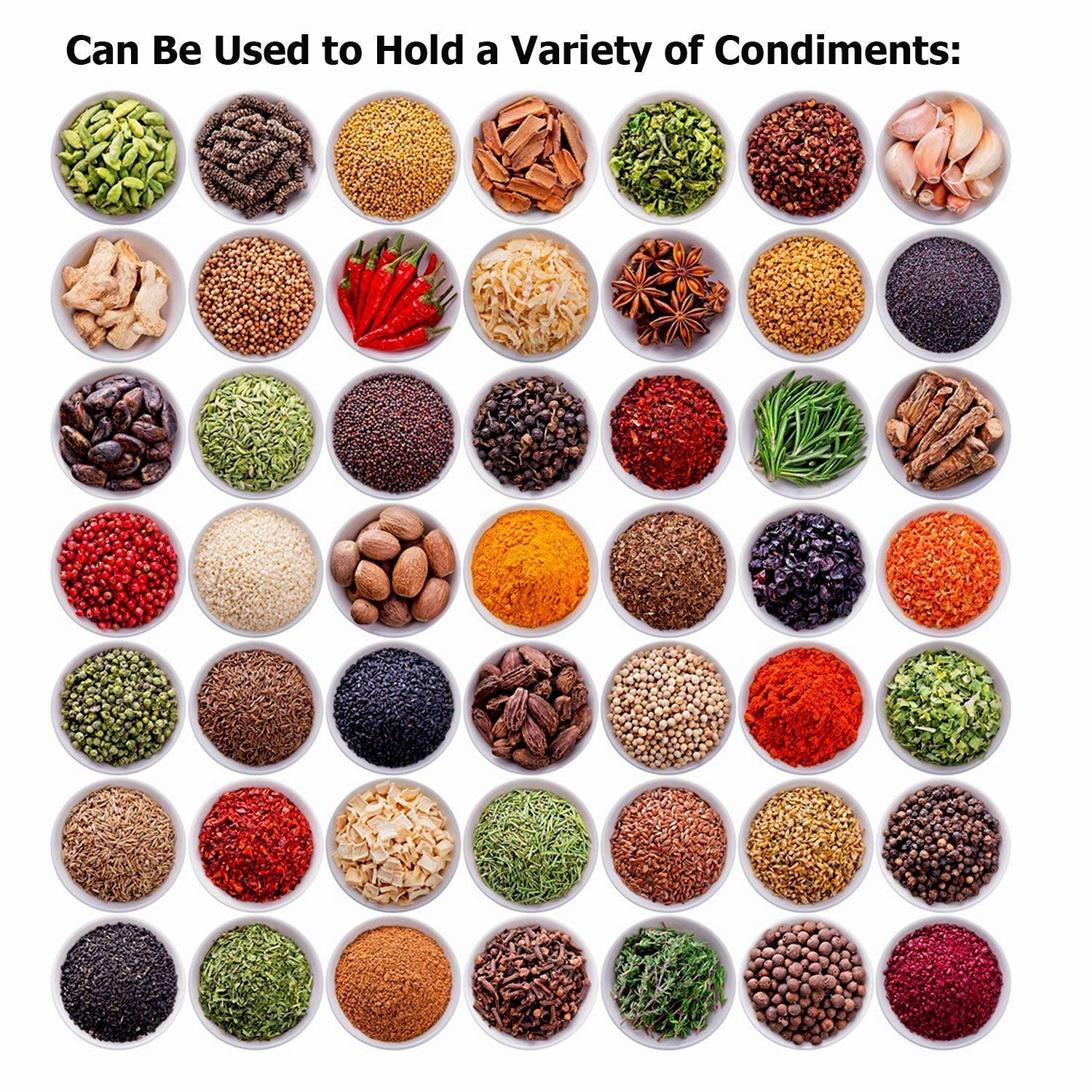 Seasoning container set can be utilized to carry a wide range of condiments: Salt, pepper, sugar, spice, corn starch and rooster broth powder and extra