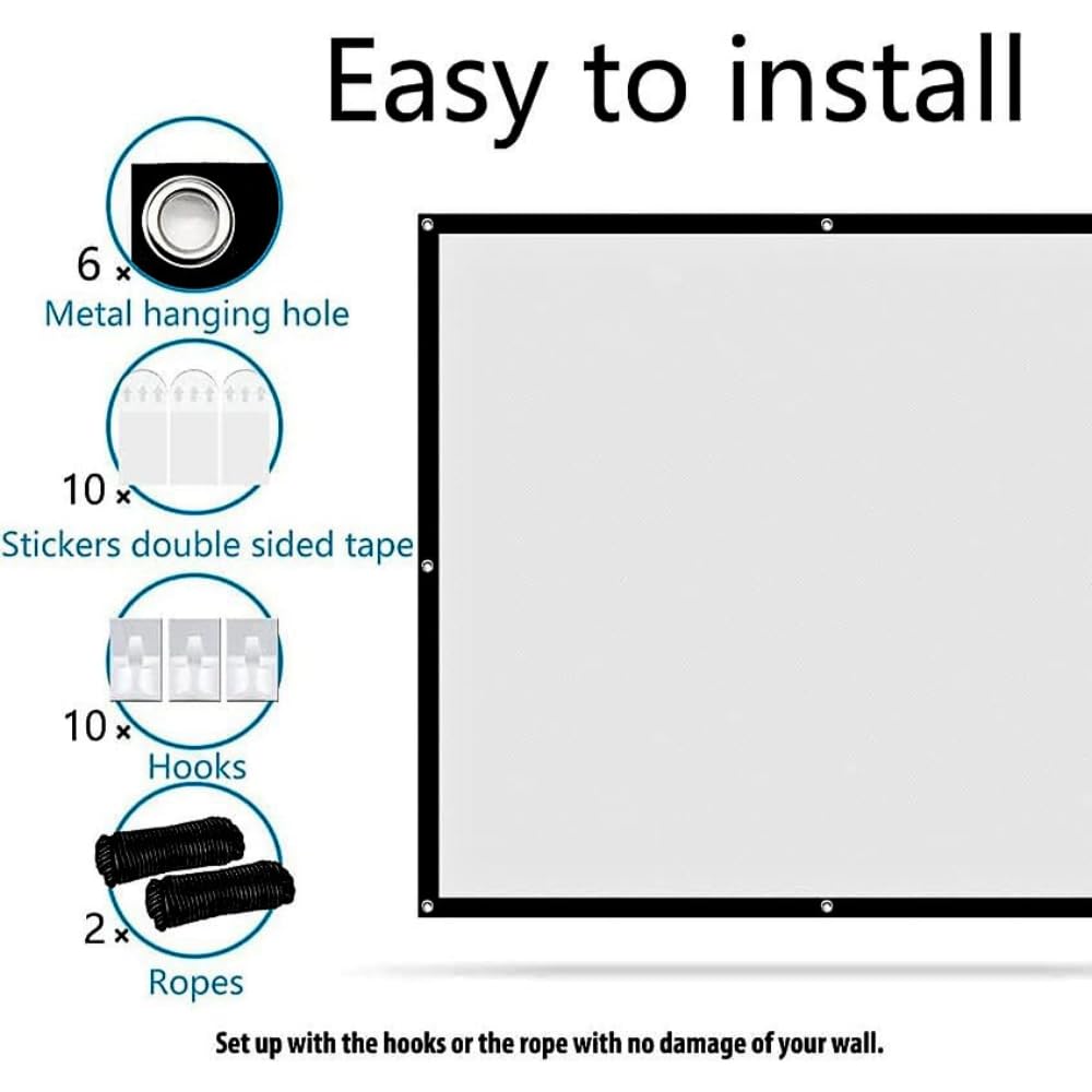 Tremendous Straightforward Put in Projector Display screen – It is possible for you to to unfold the display and mount it in actually minutes, because of the 12 metallic completed grommets which could be held on a wall utilizing hooks or cuttable rope (Hooks not embody in Package deal)
