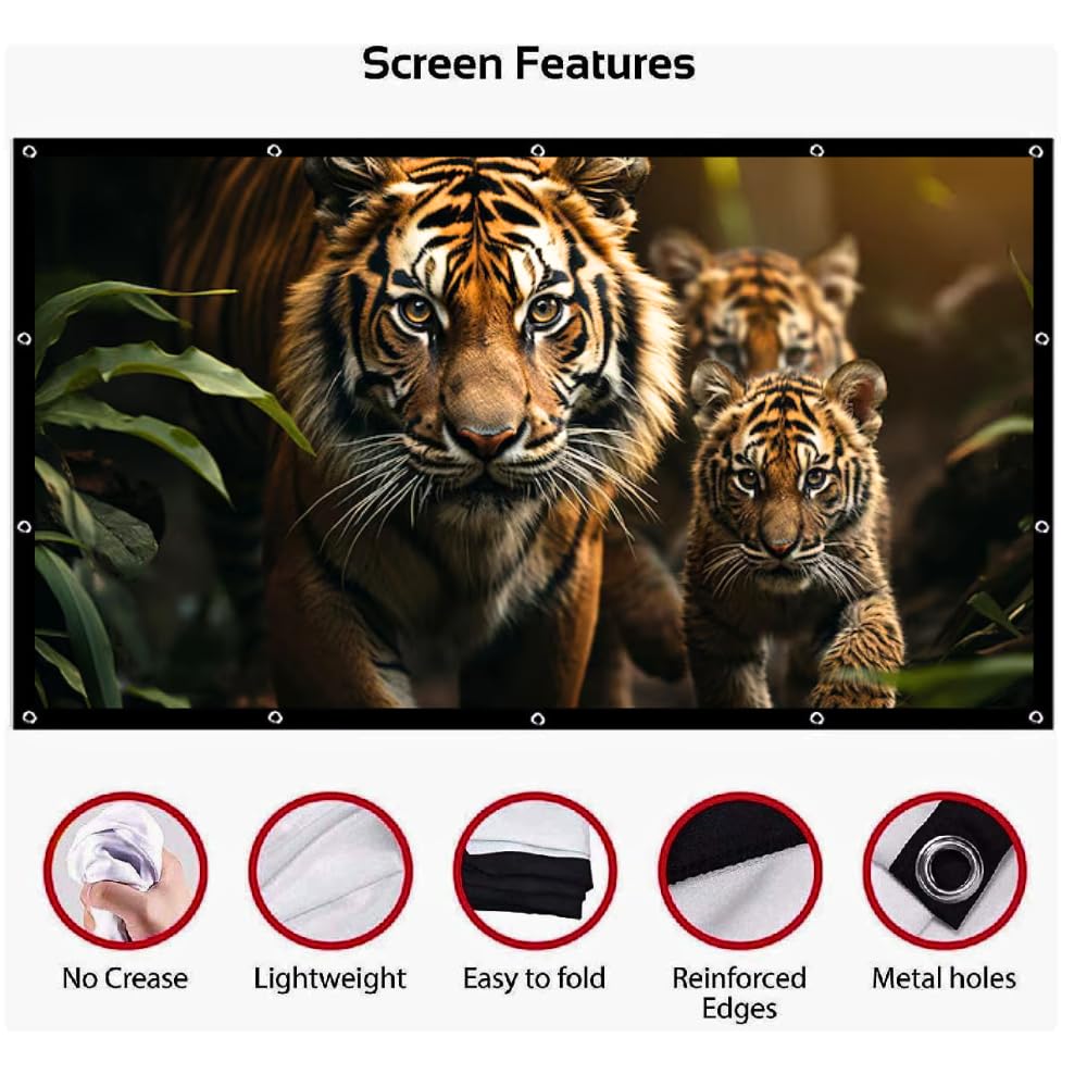Display screen Measurement : 105 inch (W) x 59 inch (H) – 120″ Inch Diagonal || Foldable and Wrinkle-free – The 120″ inch projector display is manufactured from high-quality polyester cloth to stop wrinkles. Whether or not the 3d projector display is folded or compressed.