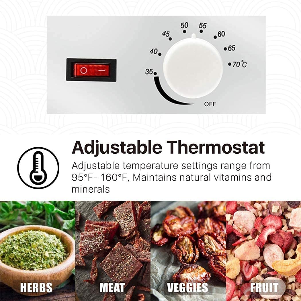 【Giant Capability】This meals dehydrating machine has the massive capability with 5 adjustable trays which might carry a lot meals, supplying you with the liberty to decide on the quantity of dried meals, excellent for family use; It will probably lock the minerals and nutritional vitamins within the meals, Hold extra nutritious