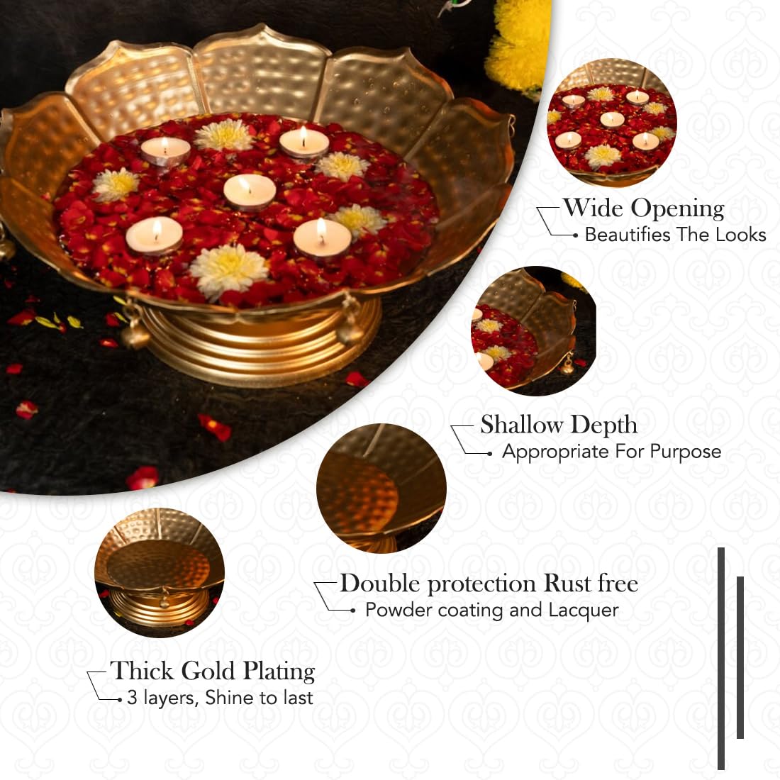 LIGHTWEIGHT AND STURDY BASE – Embark on a journey of magnificence with our urli bowl, a masterpiece designed to raise your decor. Crafted with a safe and durable base, it gracefully stands agency whereas including an air of sophistication to any event. Whether or not it is Diwali, a festive gathering, or a private second of reflection, its light-weight but sturdy design guarantees to be the centerpiece of consideration.