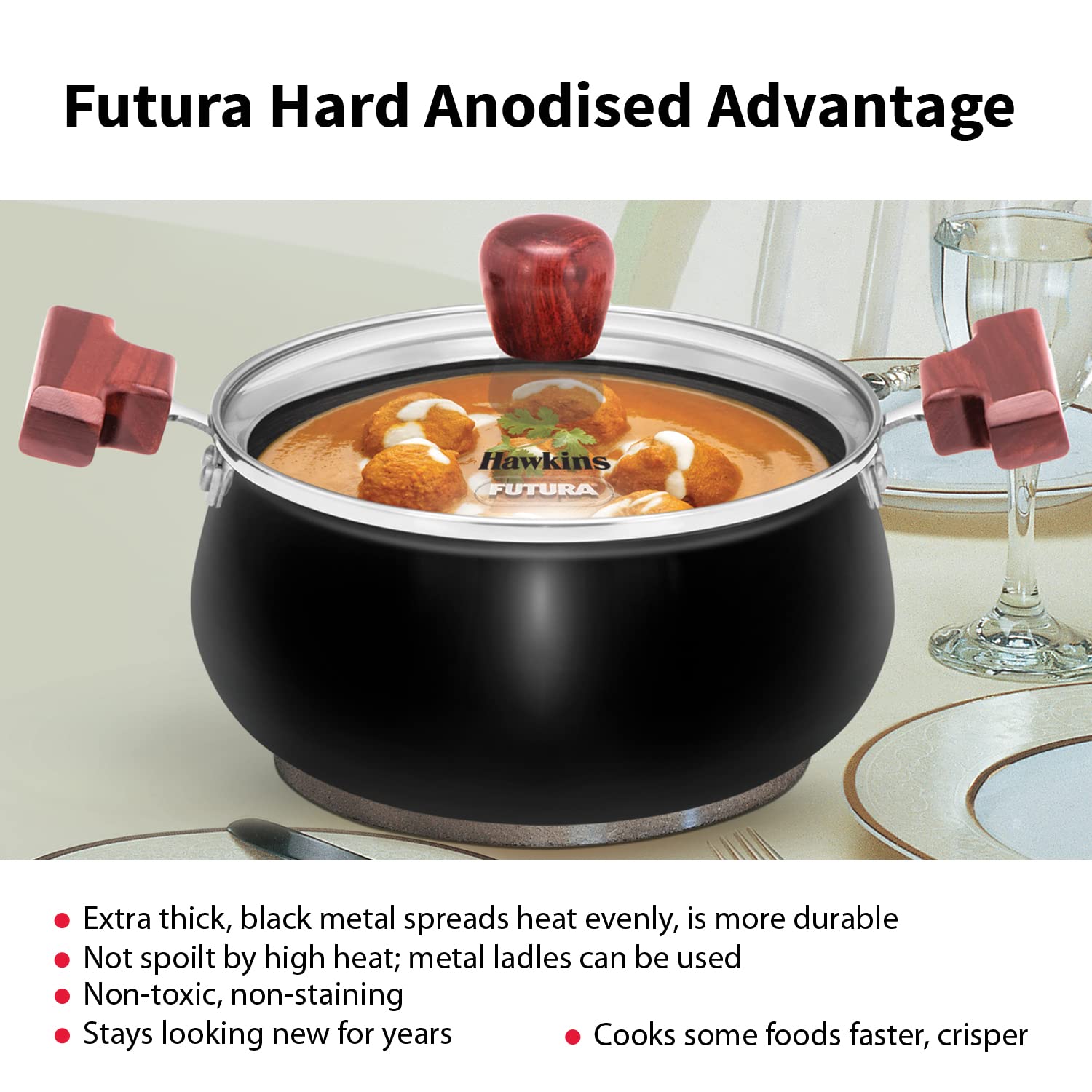 Hawkins Futura 3 Litre Cook N Serve Handi, Hard Anodised Biryani Handi With Glass Lid, Induction Saucepan, Sauce Pan, Black (Iach30G),Polished, 3 Liter
