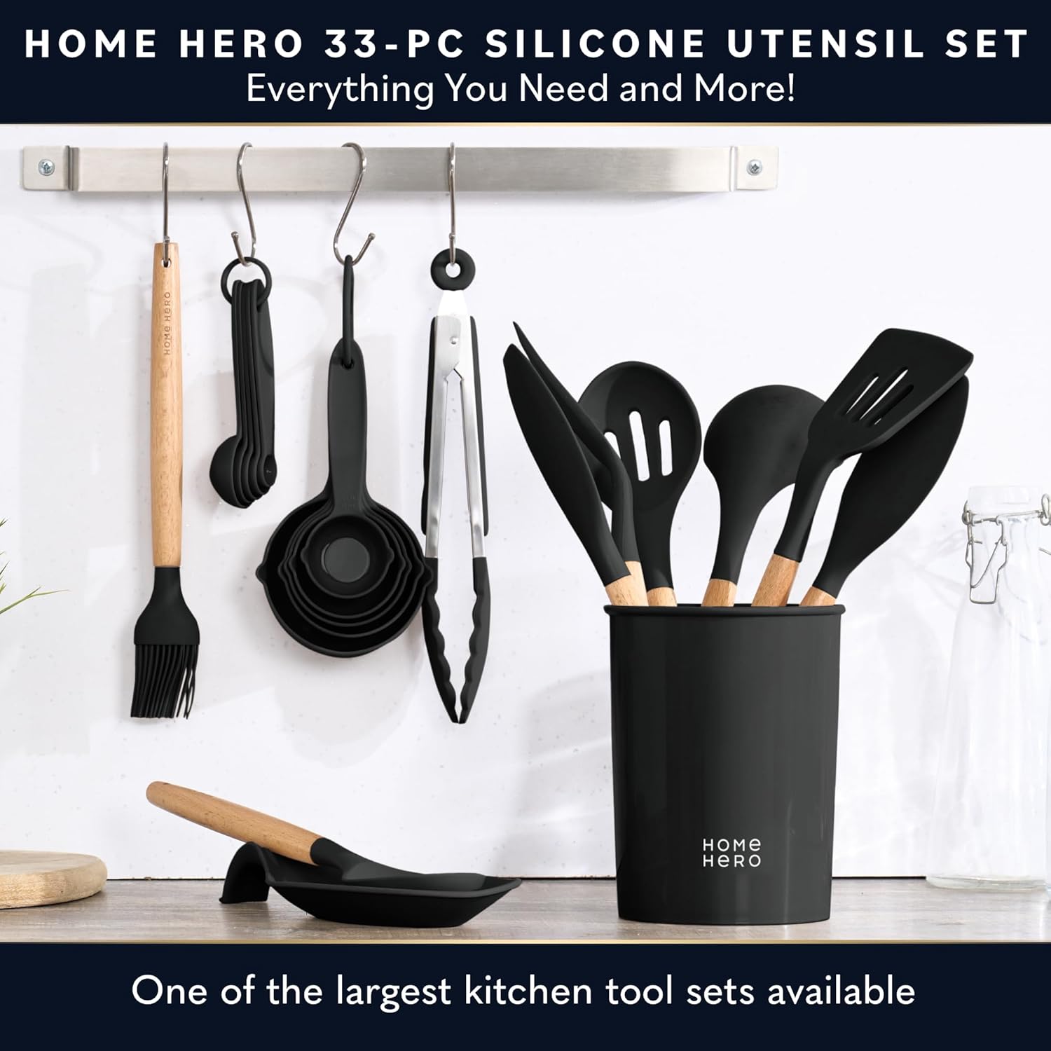 Home Hero 33 Pcs Kitchen Cooking Utensils Set, Non-Stick Silicone Cooking Kitchen Utensils Spatula Set with Holder, Wooden Handle Silicone Kitchen Gadgets Utensil Set (33 Pcs – Black)