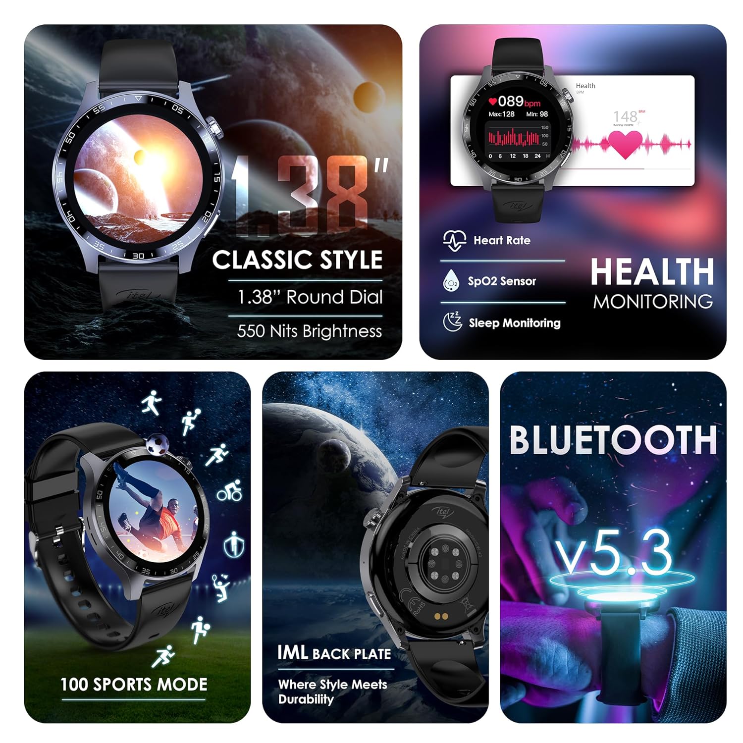 itel 42 Smartwatch with 1.38” HD IPS Display, Bluetooth Calling, 12 Days Battery, TWS Pairing, Multiple Sports Modes, IP68 Water Resistant, Heart Rate Monitoring and SpO2 Sensor (Black)