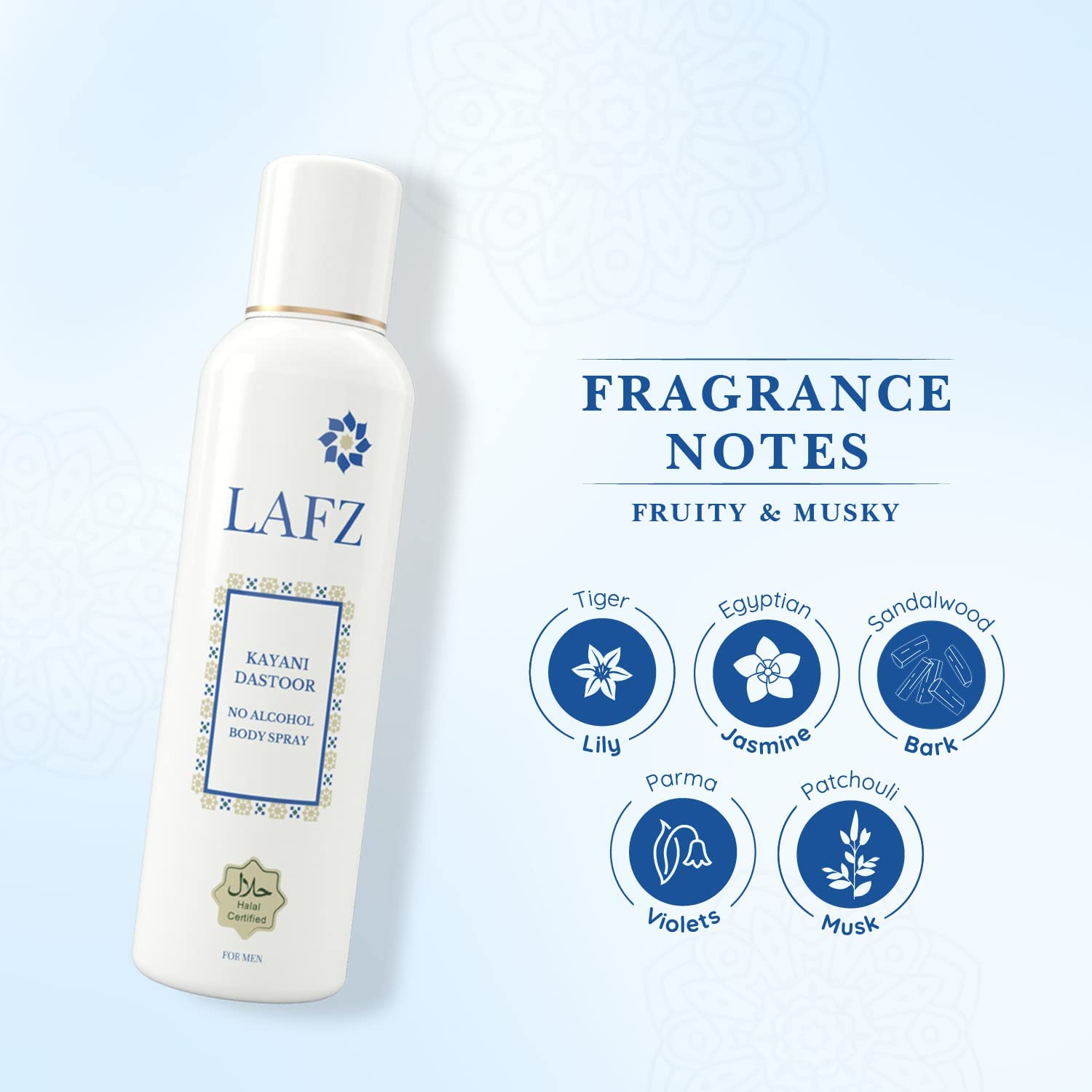 Elevate each second with Lafz alcohol-free premium males’s physique spray enriched with the purest fragrances. Our males’s deodorant ensures you embrace confidence whereas staying true to your values, by adhering to the very best requirements of purity and authenticity. Expertise enduring freshness from dawn to sundown with our long-lasting deodorant for males, that offers you unwavering freshness all through the day. Elevate your grooming routine with Lafz, as our deodorant for males combines the beautiful mix of Tiger Lily, Egyptian Jasmine, Sandalwood Bark, Parma Violets, and Patchouli Musk, delivering a singular fruity and musky scent. Free from Najis components and dangerous chemical compounds like aluminum generally present in common deodorants, the physique spray for males is infused with pure important oils corresponding to Tea Tree, Aloe Vera Extracts, and Vetiver Oil, offering moisturizing nourishment to your pores and skin. With Lafz, take pleasure in all-day freshness and a fascinating aroma that lingers, guaranteeing you keep recent and confidently scented all through your every day endeavors.