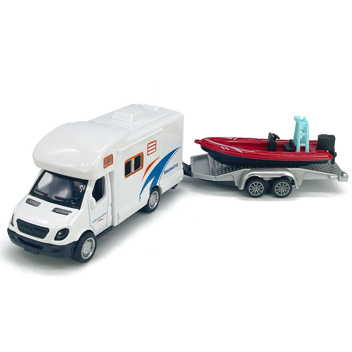 [Material] The camper toy is made from zinc alloy metallic and plastic with rubber tires, whereas the trailer boat toy is made from plastic.