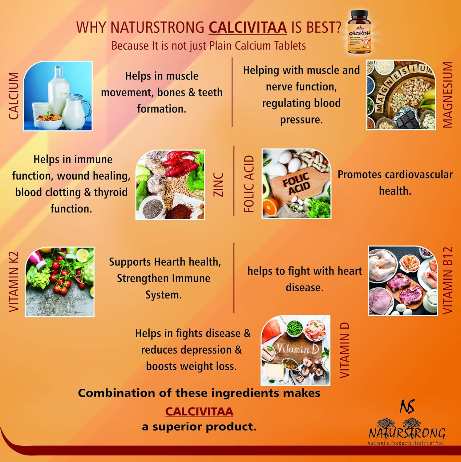 Naturstrong Calcivitaa every tablets helps to help Coronary heart Well being, Muscle Help, Enhance Sleep High quality, Strengthen Immune System, Bones Help, Joint Help, Dental Well being, Management Blood Sugar Ranges & Balace Blood Strain.