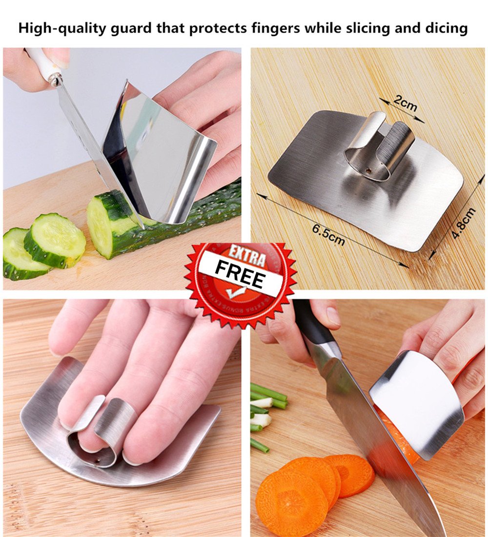 STAINLESS STEEL FINGER GUARD- The finger guard will hold your fingers secure and hidden from razor sharp knives. It comes with open ring design, appropriate for many fingers.