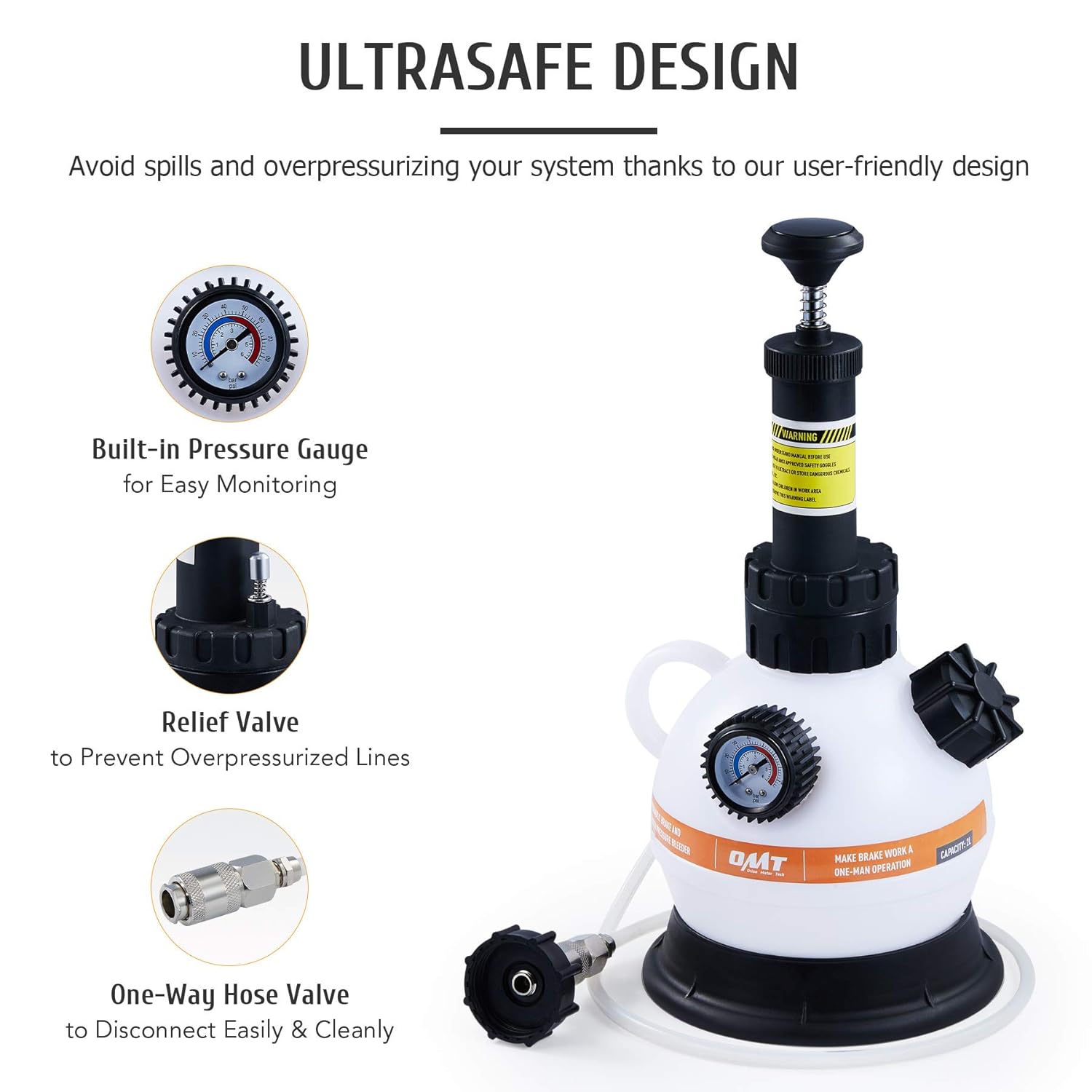 LARGE CAPACITY: This stress bleeder’s tank holds as much as 1/2 gallons of fluid, ensuring one replenish covers service to your total brake system