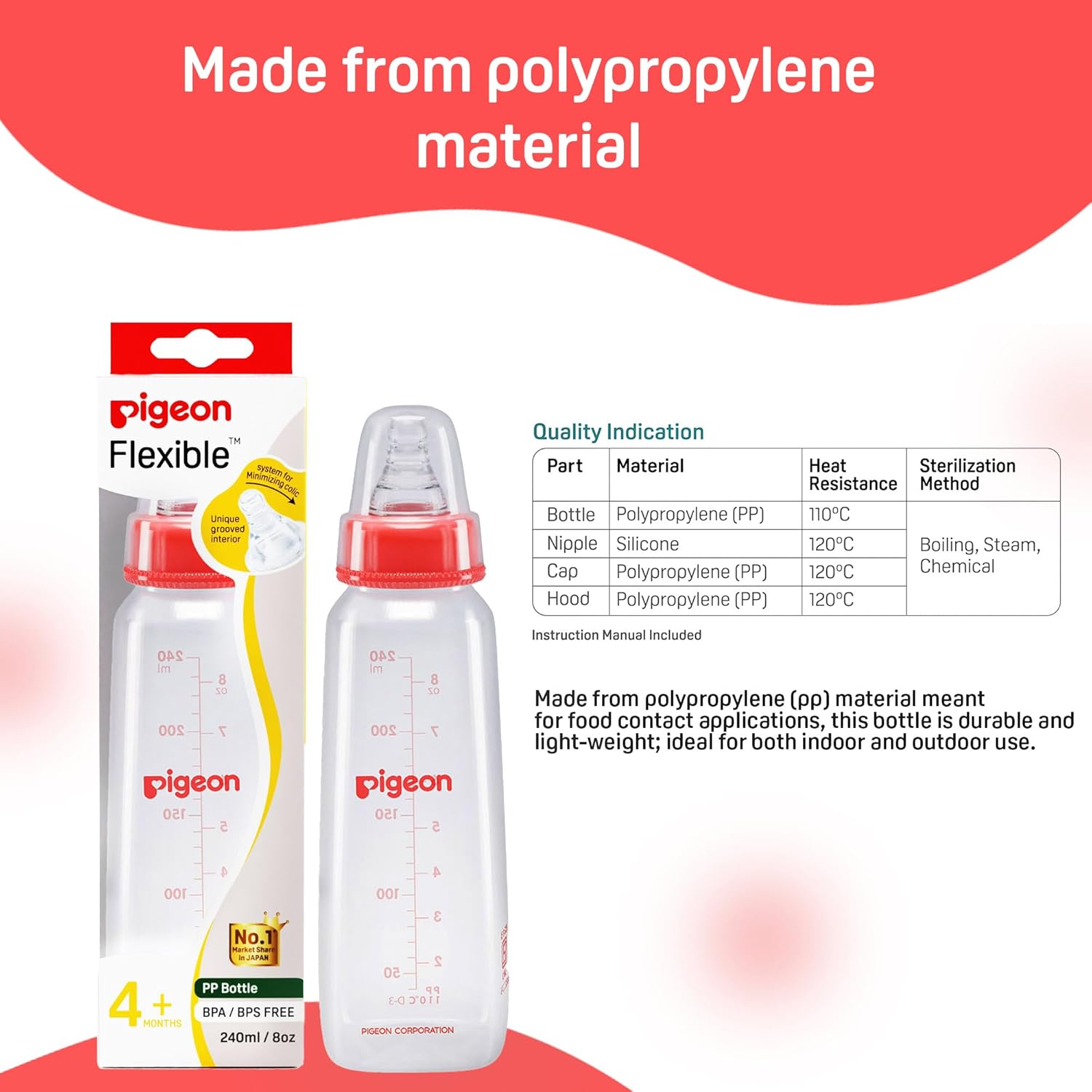Pigeon Peristaltic Feeding Bottle is good for 9+ month infants and constituted of sturdy high quality plastic