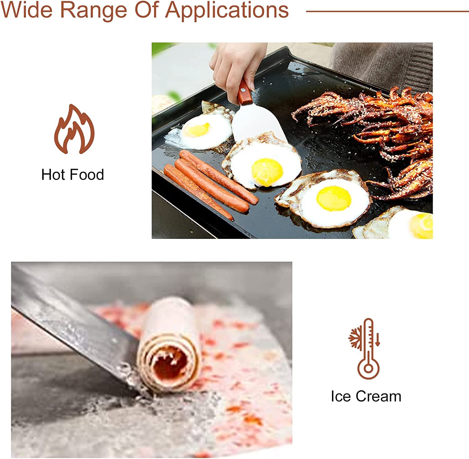 Software Excellent for flipping pizza pancakes pork chops cuts steaks burgers pancakes and eggs within the skillet. Can be used to fry fries. Nice for on a regular basis cooking.