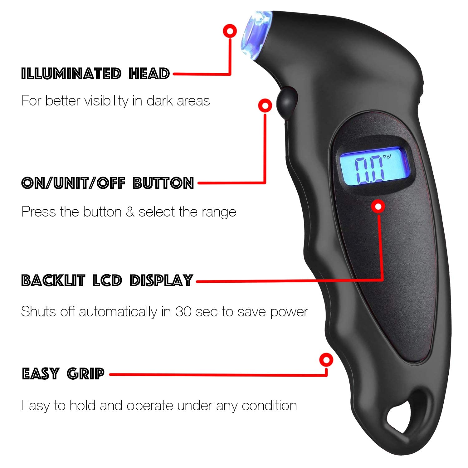Instruction: -1. Press the “Energy” button. Then look forward to 0 to show. -2. Place the nozzle of the gauge into the tire valve. Press firmly to make sure a very good seal to stop air from leaking. -3. Preserve gauge on the valve till the studying on the LCD show is ready. -4. Disconnect the gauge, then learn stress. -5. To retake the studying, merely place the nozzle of the gauge into the tire valve once more and repeat. -6. The gauge will routinely shut off 30 seconds after use. The gauge may also be manually shut off by urgent down on the “Energy” button till LCD show is off.