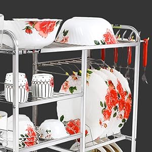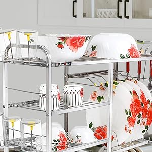 The rack has completely different compartments to carry every utensil individually and completely. It has a singular 3 tier design with non-slip pads for glasses and delicate crockery. This makes it straightforward to maintain dishes and supply optimum perform.