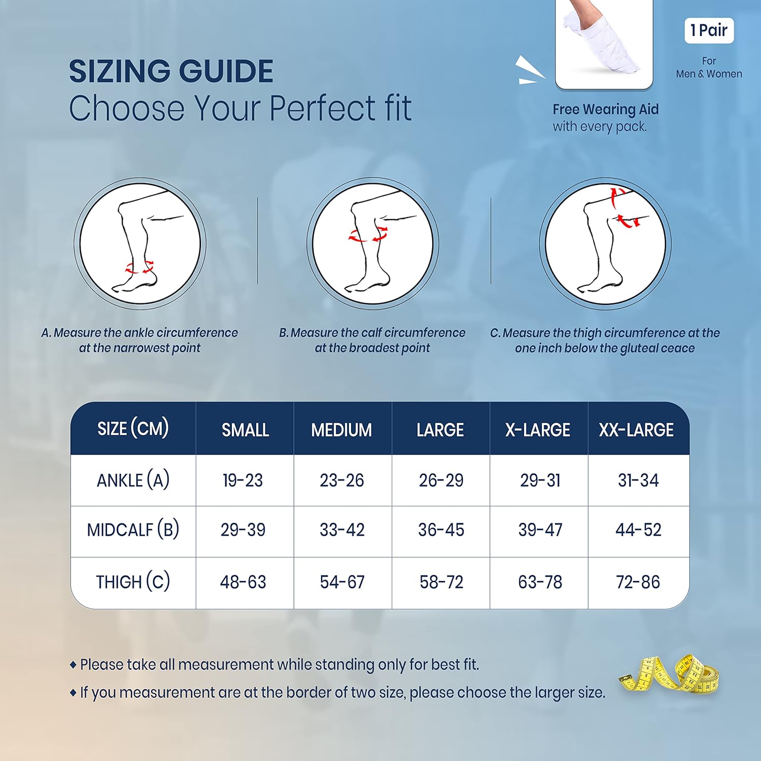 Sorgen Royale medical compression stockings makes use of graduated compression thereby exerting most strain on the ankle and steadily decreases in the direction of the calf and thigh.