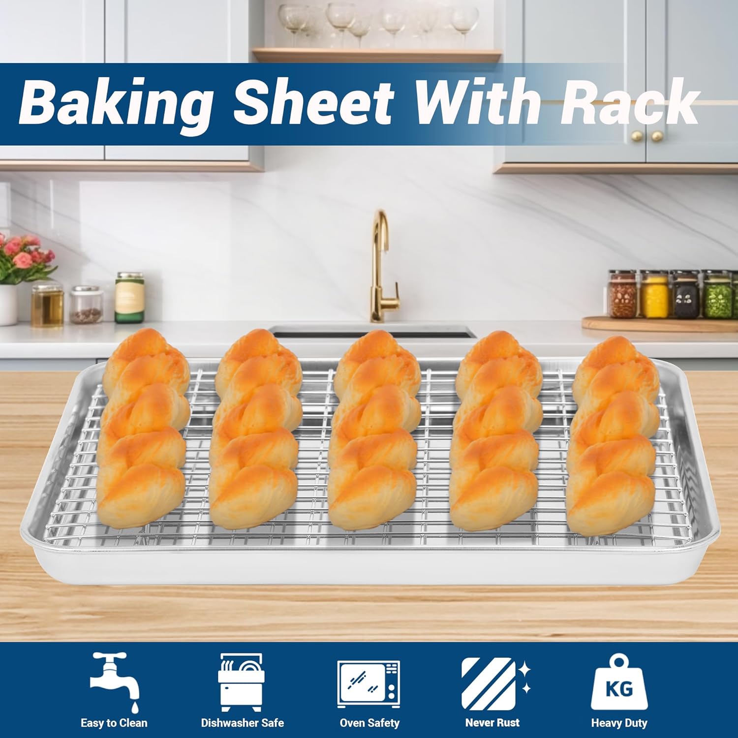 EASY TO CLEAN- The baking tray contains a mirror-polished floor that’s easy with none tough spots. Its deep sides stop juices from spilling everywhere in the oven, protecting it clear. Each the baking sheet and cooling rack can stand up to temperatures as much as 410 levels Fahrenheit and are dishwasher-safe with none discoloration.