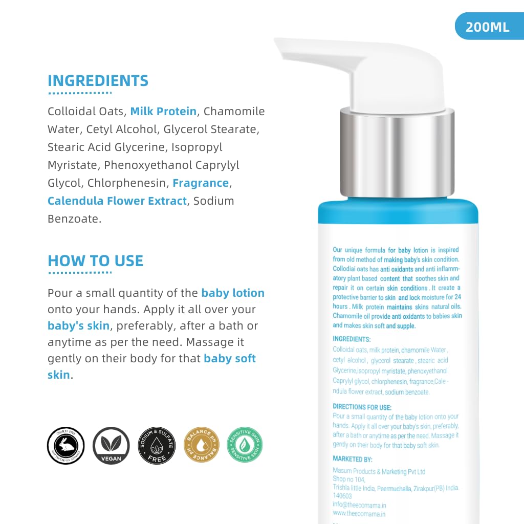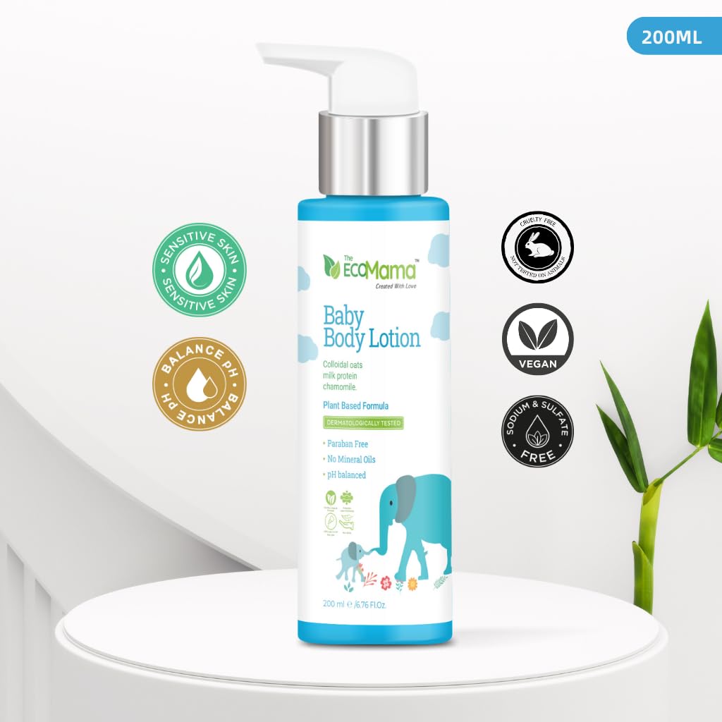 The Eco Mama Moisturizing Baby Body Lotion with Colloidal Oats, Milk Protein & Chamomile Oil (200 ML)| Maintains Soft & Supple Baby Skin, Provides Intense Moisturization & Nourishment, Helps Baby Have a Good Sleep | Toxin Free, Vegan & Senstive Skin Friendly