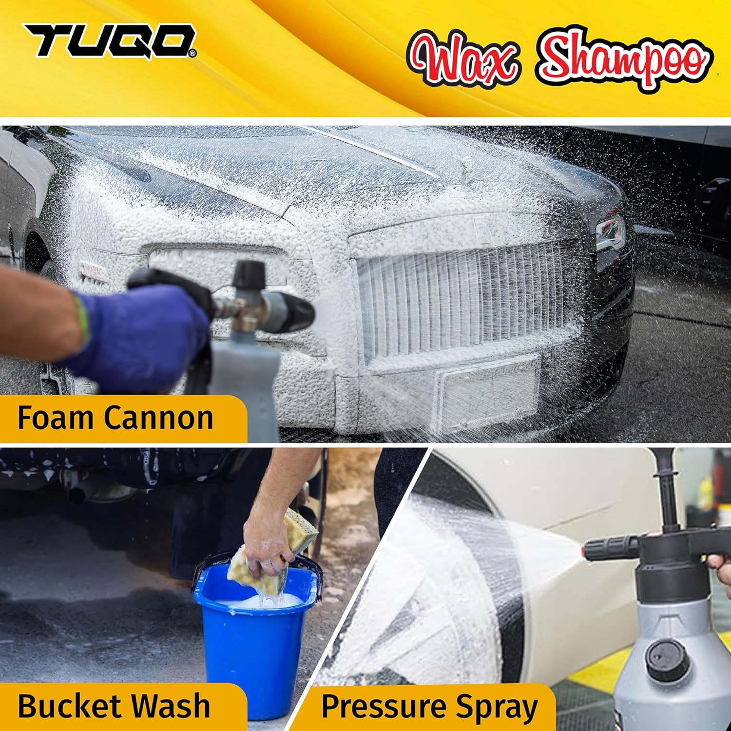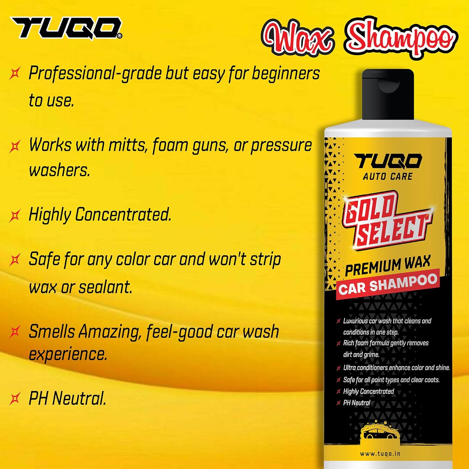 Rework your automotive wash into an opulent expertise with TUQO Golden Choose Wax Automobile Shampoo. This 2-in-1 components not solely removes mud, grime, and dirt but additionally leaves behind a protecting wax coating that delivers a superb shine and safeguards your paint. With its PH-neutral mix, it’s mild in your automotive whereas producing a thick, wealthy foam that effortlessly lifts away particles. And to prime it off, the refreshing mango scent makes each wash a delight. Whether or not you’re utilizing a foam cannon, foam gun, or bucket, TUQO ensures a spotless end each time.