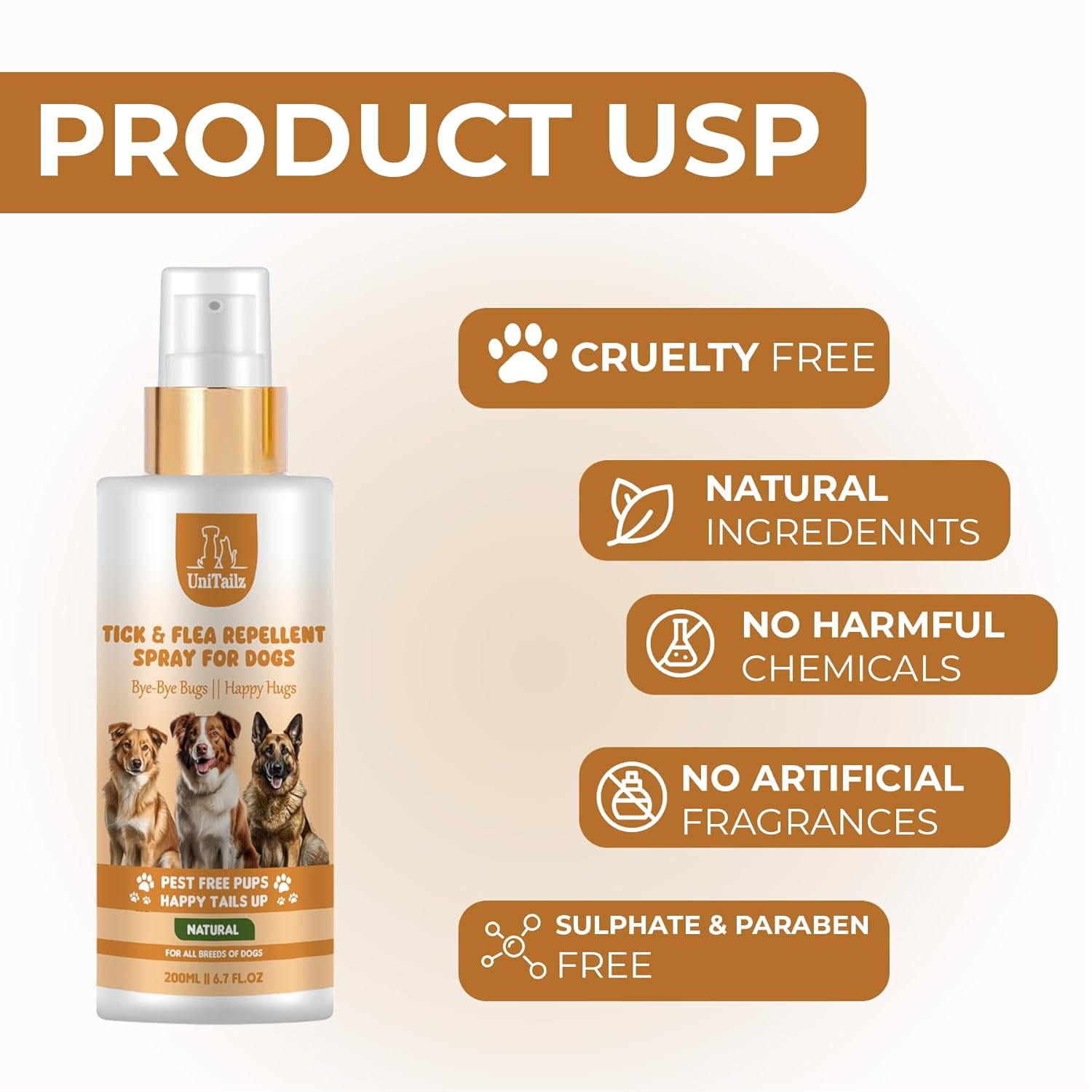 Unitailz Tick & Flea Repellent Spray for Dogs | Anti Tick Spray for Pomeranian Dog | Effective Shampoo Spray for Fleas, Tick, Lice, Anti-Fungal |Relieves Itching & Irritation for All Dog Breed –200ml
