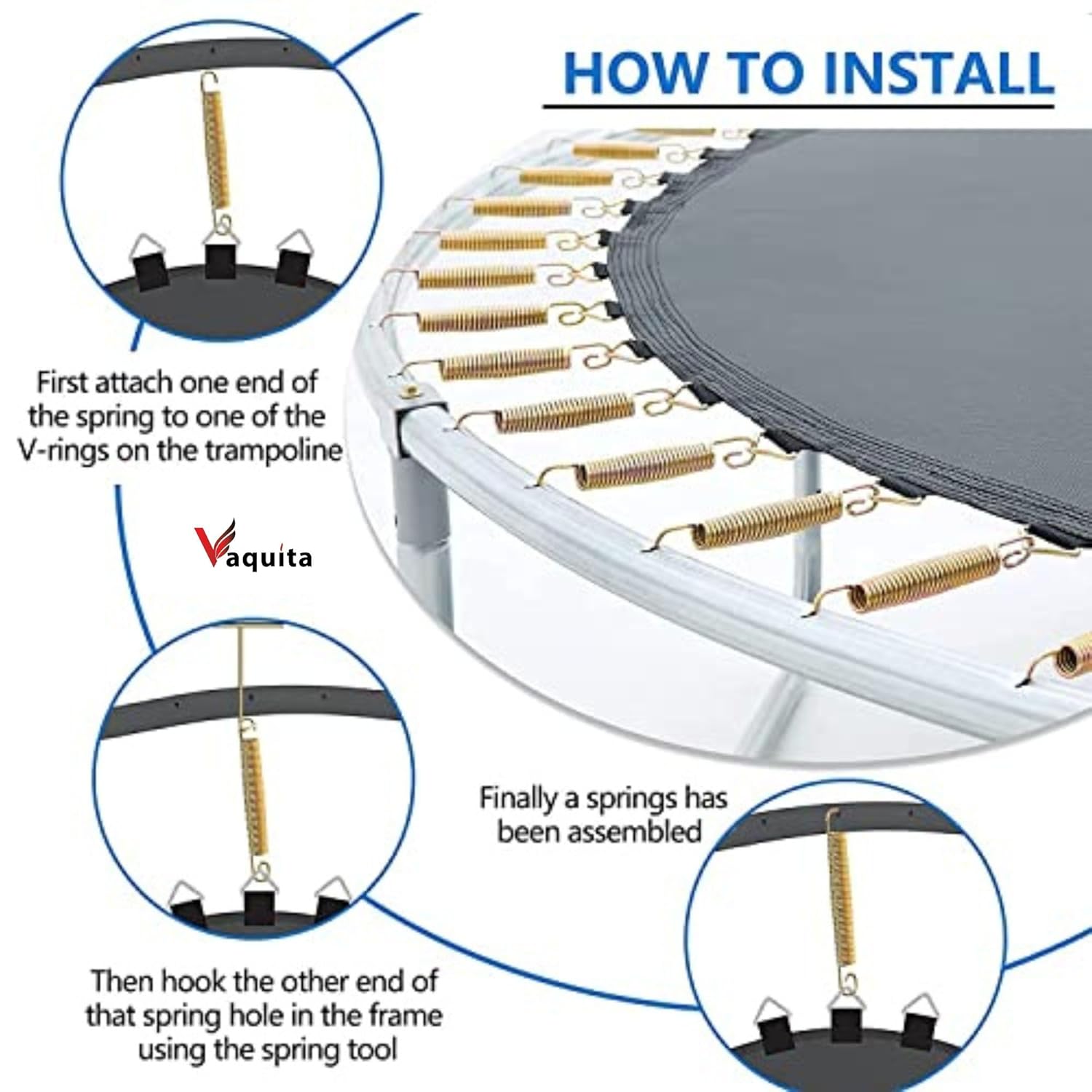 Measure the size of the unique outdated spring from one finish to the opposite when it’s not stretched. Decide the right dimension spring it is advisable to buy.Firstly, please hook the bent finish of the spring onto the triangular loop on the leap mattress, then, utilizing the T-hook software, hook the opposite bent finish of the spring into the corresponding gap on the body.Test to ensure they’re neat.