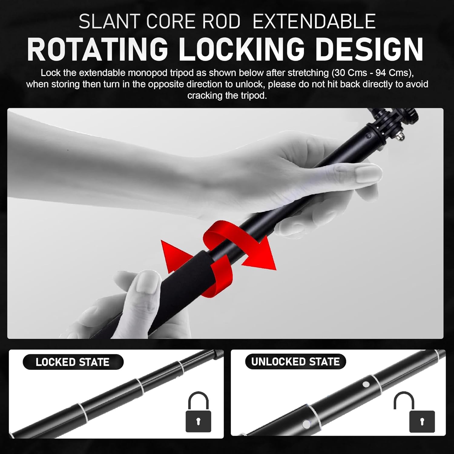 Extendable and Adjustable: With a minimal size of 30 cm and a most size of 94 cm, this monopod tripod presents versatile peak adjustment. Seize the right angle on your photographs effortlessly, offering flexibility in numerous capturing situations.